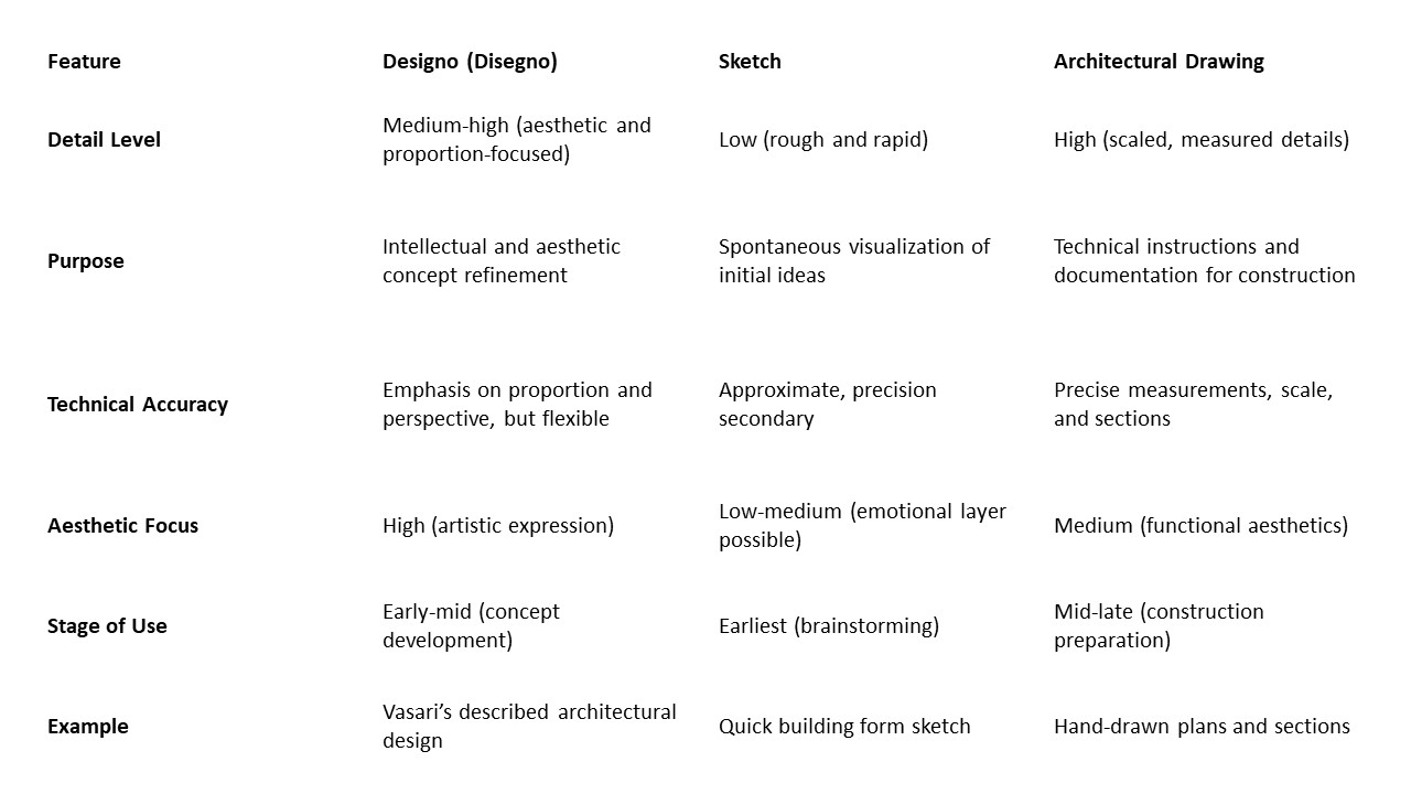 Designo functions as an overarching concept, combining the spontaneity of sketches with the technicality of architectural drawings. Sketches are the most accessible and creative, architectural drawings are the most professional and practical, while designo adds philosophical depth.