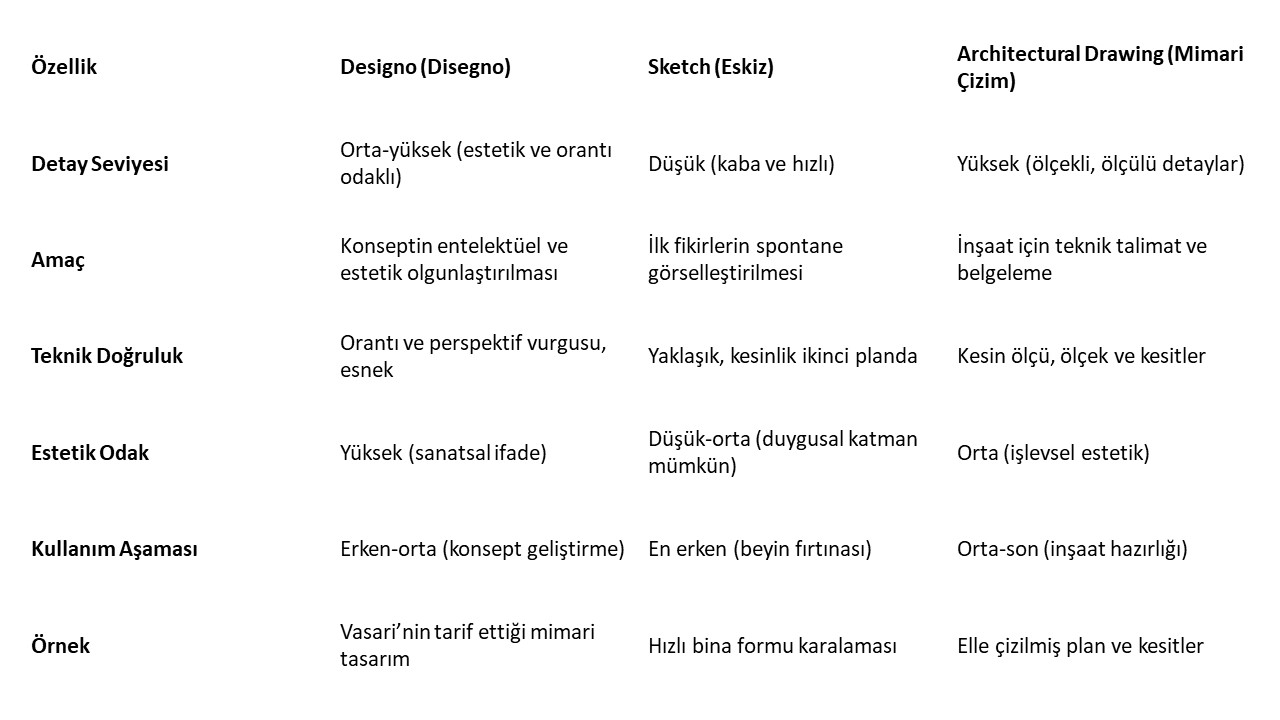 Designo/Disegno, Sketch (Eskiz) ve Architectural Drawing (Mimari Çizim) terimleri, mimari görselleştirmenin farklı yönlerini temsil eder ve her biri mimari ile sanatın yaratıcı ve teknik süreçlerinde kendine özgü amaçlara hizmet eder. Bu terimlerin tanımları, özellikleri, amaçları ve kullanımları, tasarım sürecinin farklı aşamalarındaki rollerini—fikir oluşturmadan gerçekleşmeye kadar—ve mimari pratiğin evrimindeki tarihsel önemlerini vurgular.